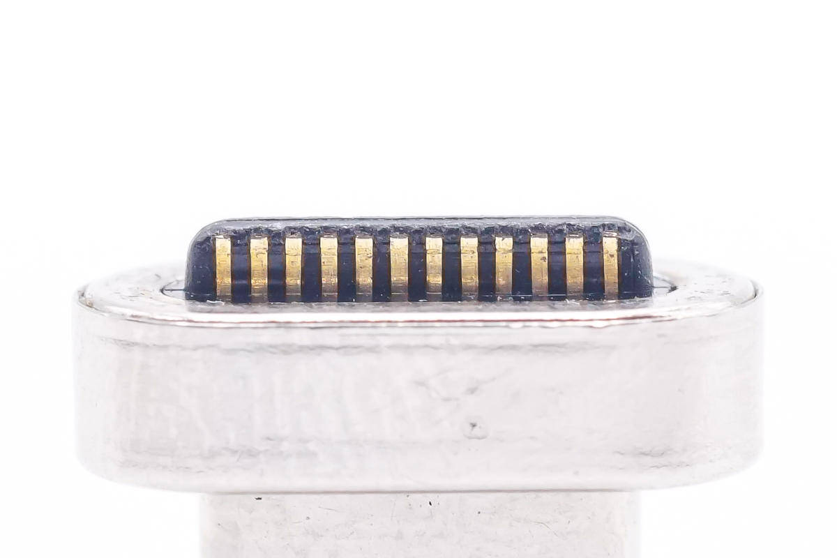 Detail internal ujung pria USB-C dirancang untuk pin penuh.