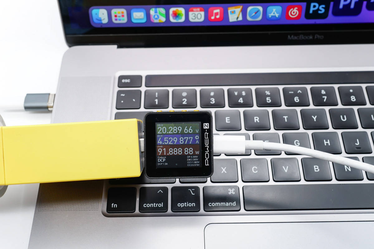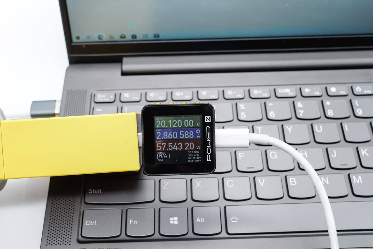 Pertama-tama, mari kita lihat pengisian cepat. Gunakan pengisi daya 100W dengan adaptor magnetik kepala lurus untuk mengisi daya laptop dengan daya 20.12V 2.86A 57.54W.