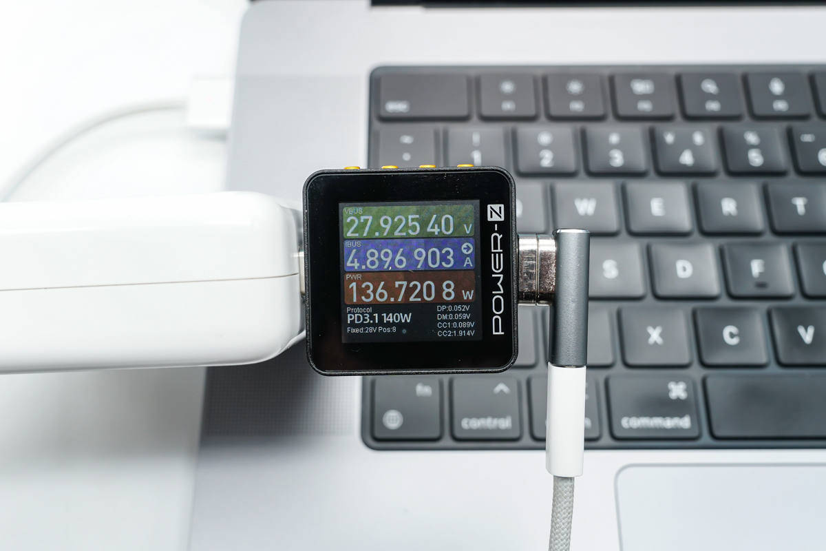 Rata... ini juga mendukung pengisian cepat 140W, dan adaptor terhubung ke pengisi daya galium nitrida 140W Apple dan kabel pengisian cepat MagSafe 3. Saat ini, tegangan pengisian adalah 28V dan dayanya 135,72W.