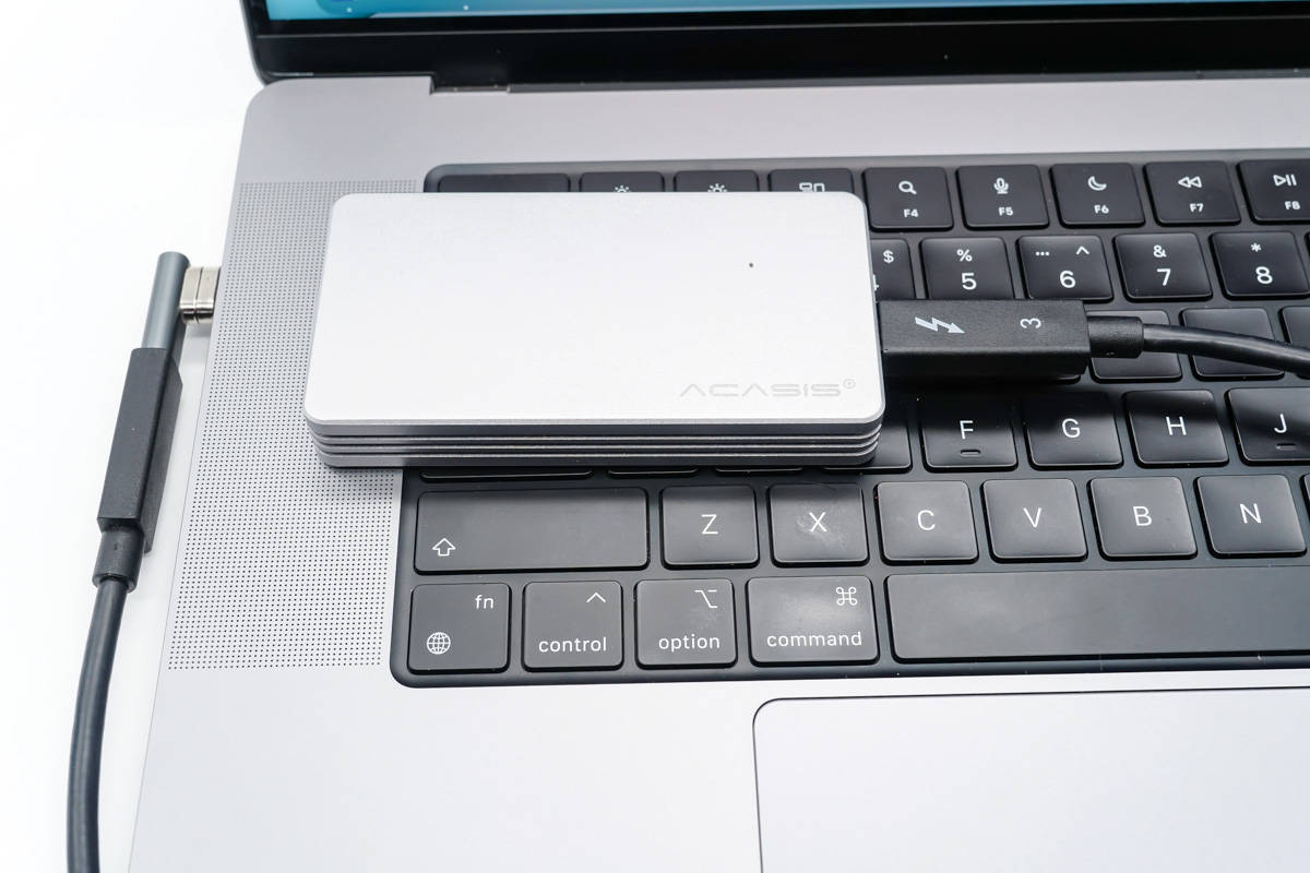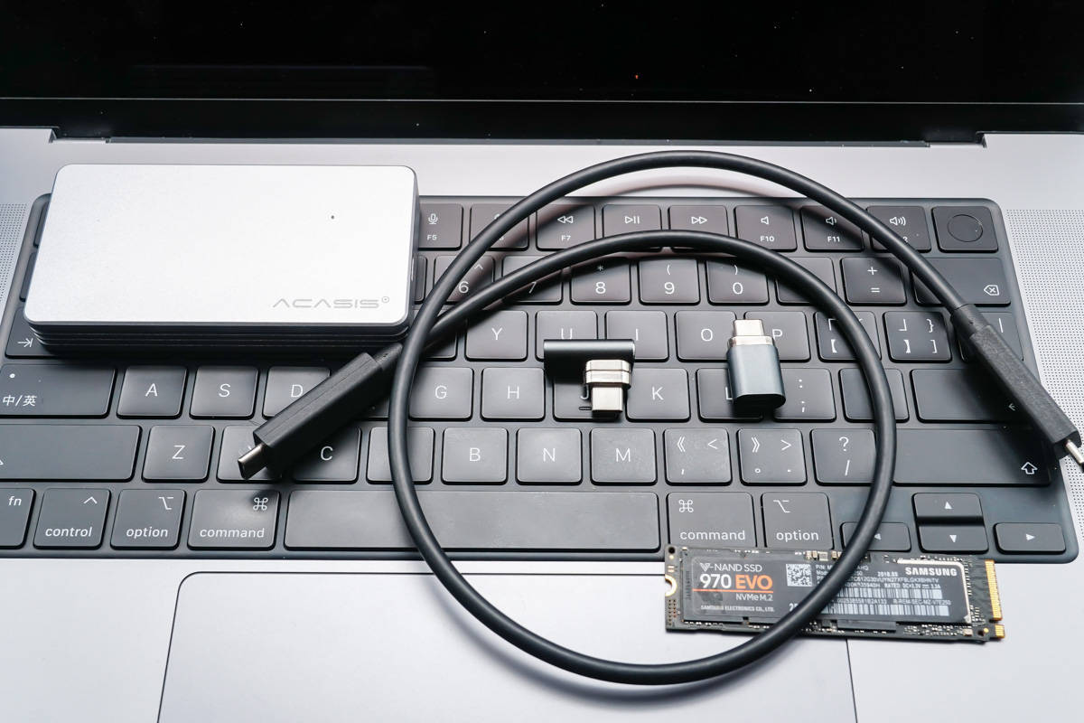 Selanjutnya, mari kita lihat tes transmisi data. Alat yang digunakan adalah solid-state drive Samsung 970 EVO, hard disk box Thunderbolt 3, kabel data Thunderbolt 3, dan dua adaptor.