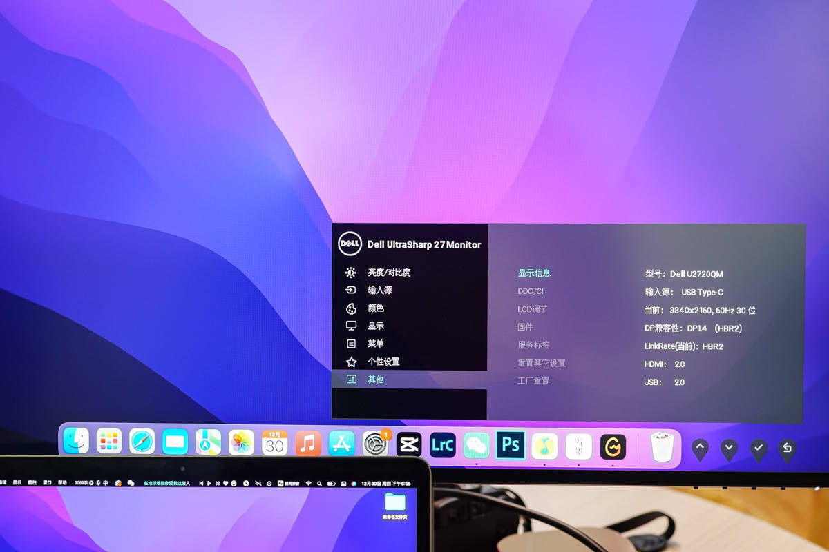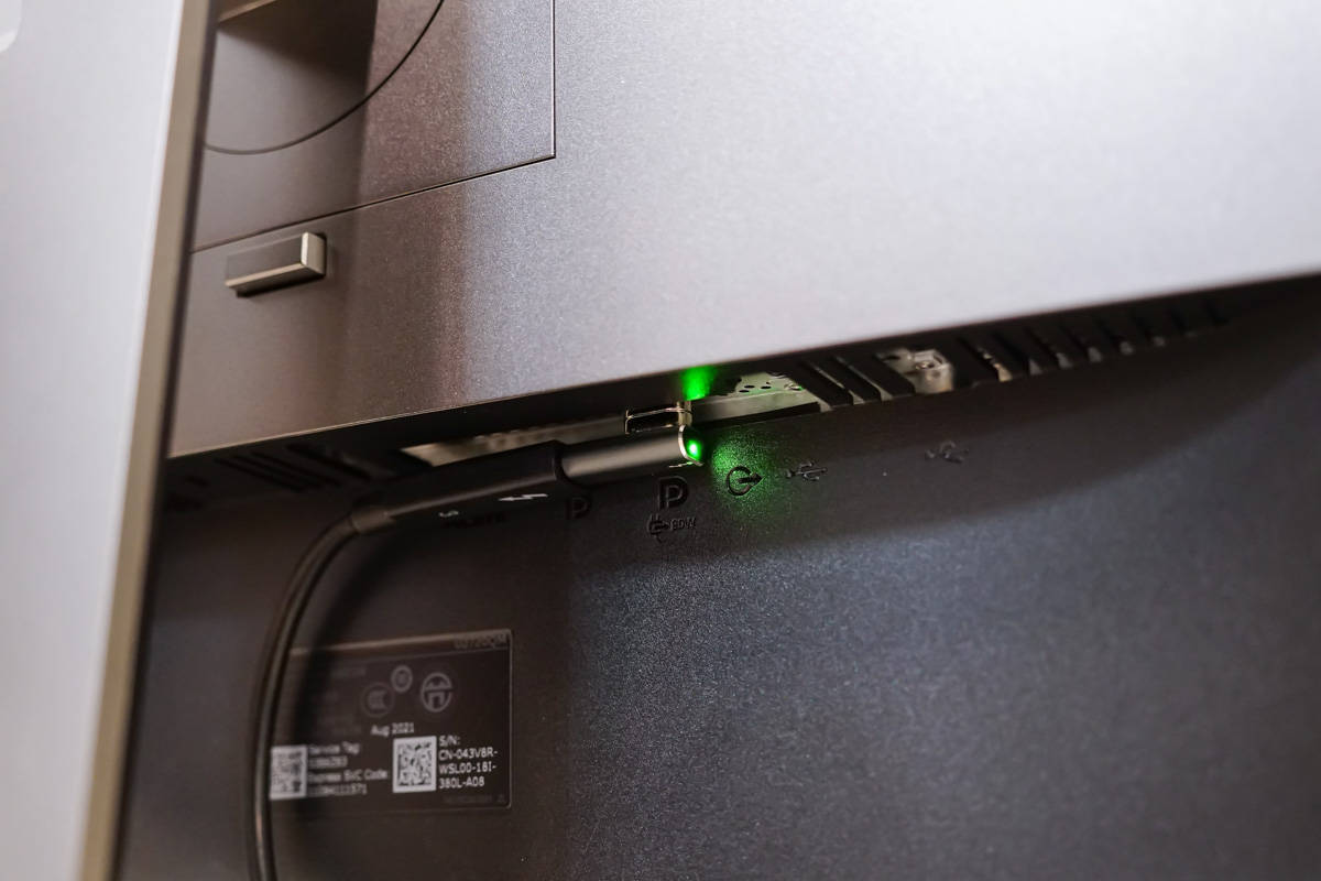 Selanjutnya, mari kita lihat transmisi video, sambungkan kabel data Thunderbolt 3 ke monitor Dell U2720QM 4K melalui adaptor.