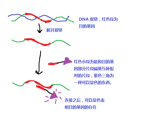 Di bawah pH, suhu, dan kekuatan ion yang sesuai, probe DNA dapat berikatan hidrogen dengan DNA untai tunggal atau RNA komplementer yang tidak berlabel dalam sampel yang akan diuji dengan memanfaatkan akurasi tinggi dari denaturasi molekul, renaturasi, dan pasangan komplementer basa. bergabung membentuk kompleks untai ganda.